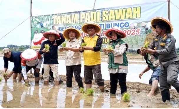 Bungo-Makalamnews.com – Dinas Tanaman Pangan Holtikultura dan perkebunan bersama Bupati Bungo, H. Dedy Putra, SH. M.kn , melaksanakan kegiatan tanam padi sawah bersama di lokasi Oplah Non Rawa Dusun Sari Mulya, Kecamatan Jujuhan Ilir, Kabupaten Bungo, Minggu (5/4/2026).
