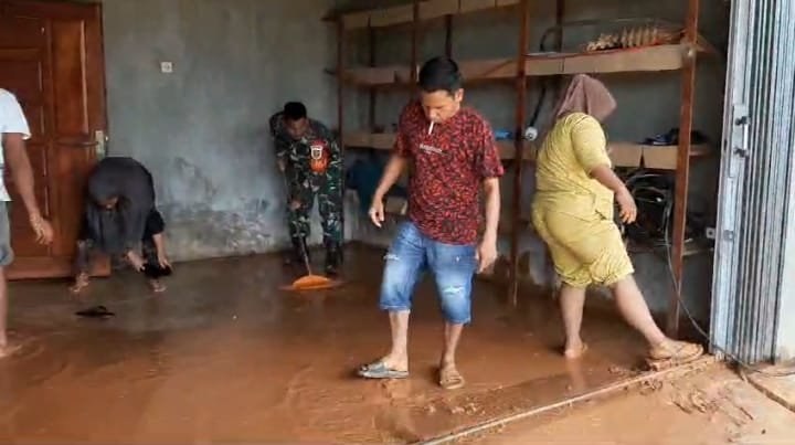 Pasca Longsor dan Banjir, Babinsa Koramil 420-07/Sungai Manau Bersihkan Tanah dan Lumpur bersama Masyarakat