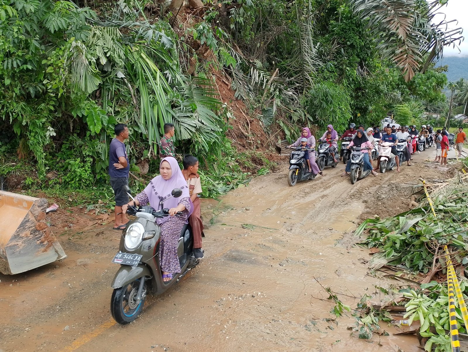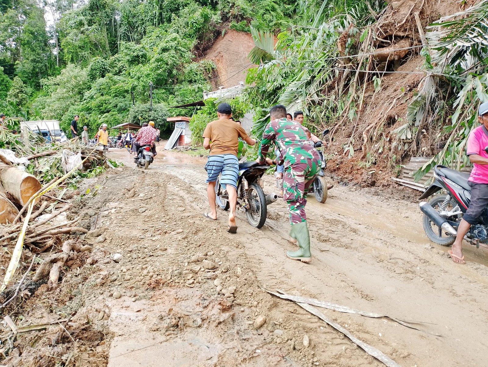 Dari saat terjadinya Banjir sampai pasca longsor hingga hari ini para Babinsa Sungai Manau yakni Serda Sofran Ihsan membantu membersihkan jalan guna membantu pengendara yang melewati jalan yang di penuhi tanah longsoran sehingga masyarakat bisa melewati badan jalan yang di tutupi oleh bekas tanah longsoran.